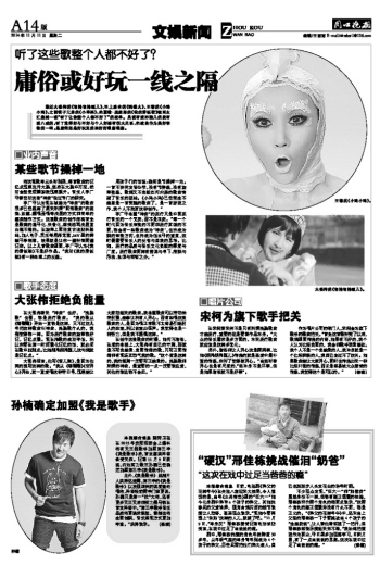 最近大张伟的《胡撸胡撸瓢儿》、至上励合的《鸭梨大》、王蓉的《小鸡小鸡》,之前筷子兄弟的《小苹果》、约瑟翰·庞麦郎的《我的滑板鞋》被网友汇集到一张“听了让你整个人都不好了”的歌单。虽说有爱孙猴儿的就有爱八戒的,听了觉得好与不好与个人好恶有很大关系,但歌曲作为美好事物的一种,是庸俗还是好玩真的要好好琢磨琢磨。