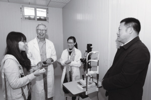 澳大利亚眼科专家瑞查德,马来西亚眼科专家洪君翔为患者做检查。
