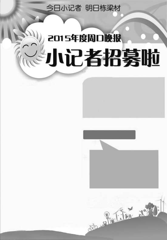 提高交际能力——敢说话 培养写作能力——敢动笔 提高分析观察能力——敢思考 锻炼社会实践能力——敢做事 加入小记者好处多多 周口晚报小记者活动中心 地址:周口市周口大道周口报业大厦11楼 电话: 13592220007 13592220017 18736240557 项城小记者站:15939433188 淮阳小记者站:13592220025 商水小记者站:13939418492 西华小记者站:13839464569 周口晚报小记者团是根据市委宣传