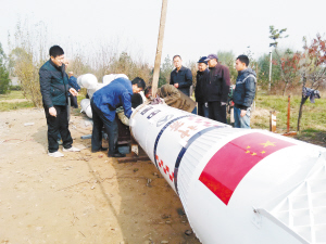 本报讯 中国首次载人航天飞行发射的“长征二号F运载火箭”“长”啥样?昨天上午,记者在周口公园国防园看到,工人们正在组装“长征二号F运载火箭”模型。今日起,它将在园内首次亮相,届时市民可前去一饱眼福。