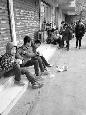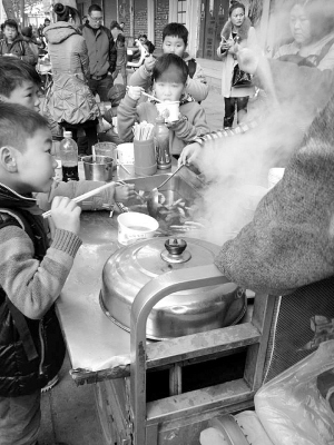 在一个小吃摊前,记者看到七八个孩子围着一个滚烫的开水锅捞东西。由于人太多,没找到凳子的孩子索性坐在附近商铺的台阶上吃了起来。在这个小吃摊旁,两名家长指着自己的孩子不停地相互“诉苦”。一位家长说:“家里煮好的有稀饭,有炒好的菜,孩子偏偏不吃,哭着喊着要来吃这‘关东煮’,不让他吃学都不想上了,我是一点儿办法都没有。”另一位家长则说:“我家孩子也一个样,每天早上都要来这儿吃一碗,不让吃就不高兴。”