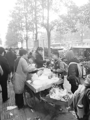 本报讯 11月18日7时许,记者来到六一路小学门前,看到许多小吃摊前围满孩子,有的小吃摊前甚至排起长队。