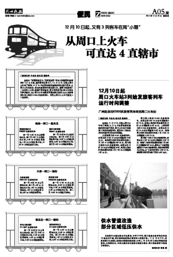 周口到广州的K1006次旅客列车,由现在的11时50分发车调整到12时19分,终到广州的时间由原来的第二天8时37分调整到9时30分。原来从广州返回到信阳的K1008次旅客列车,将延伸终到周口火车站,从广州发车时间为14时07分,终到周口的时间为第二天的12时26分。