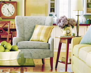 乡村生活的悠然主要体现在“回归自然”,在室内环境中力求表现悠闲、舒畅、自然的田园生活情趣。天然木质家具和能看到木头纹理的地板,让室内充满自然、朴素的感觉。蓝灰色的布艺沙发,点缀灰色暗纹的图案,加上暖暖的格子靠垫,乡村的慵懒立即体现出来。