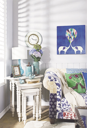 白色的基调带来安宁整洁的感觉,三个白色的高矮不同的边桌搭配在一起,少了单一家具的呆板,摆放上湖蓝色的装饰品,墙角顿时充满了层次感。而色彩斑斓的沙发,有蓝、黄、红等多种色彩搭配在一起,与同样斑斓的靠垫、墙上的图画,组成了让人心生喜悦的一角。
