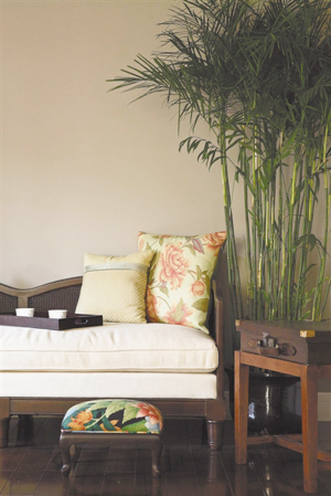 墙面的颜色深沉而不单调,几棵瘦长的热带绿色植物为墙面增添了生机。实木框架的沙发比较厚重,常常用于休闲区,但白色沙发垫的使用减轻了实木框架的厚重感,花朵的靠包和脚凳,都起到提亮色彩的作用。在休闲沙发上喝茶聊天,舒适地享受一隅风景。
