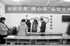 除了一些需要及时处理的“微心愿”外,社区每月都会向居民征集“微心愿”,之后进行汇总梳理,研究分析其可行性,按照政策宣传、法律援助、医疗保健、扶贫帮困、便民利民、文化娱乐、治安调解、环境保护等进一步细化分解,同时确定服务的标准和时限,并在每月的第一个周的星期六例会日向在职党员发布,由在职党员主动认领,志愿结对帮扶。
