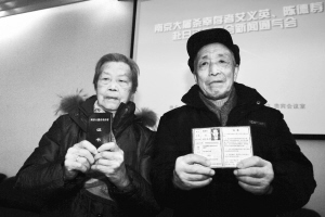 12月4日,南京大屠杀幸存者艾义英(左)、陈德寿在侵华日军南京大屠杀遇难同胞纪念馆内展示幸存者证书。