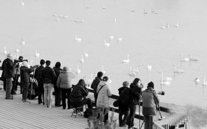 市民和游客在三门峡黄河湿地白天鹅栖息地拍摄观光(12月2日摄)。