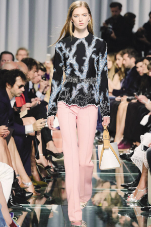 Gucci 2015年早春系列,主要是探求纯美与内在力量之间的平衡,并且从视觉和触觉上诠释出不一样的Gucci女性。在新系列的设计中,各种面料展现出不同以往的风采,呈现出非一般的幻象视觉效果,品牌的经典Flora图案也得以全新风格展现。与加拿大艺术家Kris Knight合作的特色植物印花,出现在柔美真丝束腰T恤连衣裙上,显得暗香浮动。在该系列中,也不乏突显实力的大衣单品,尤其是纳帕皮革仿蟒蛇纹大衣搭配薄荷色短裙和米色上衣,营造了浓浓的海洋氛围。