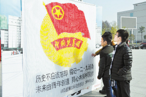 12月8日,一幅以纪念一二·九运动为主题的巨幅团徽树立在周口师范学院杏坛广场上,吸引了众多在校学生观看并合影留念。据了解,这幅团徽由周口师范学院师生耗时一周,用七万余颗角珠手工串制而成,用以纪念一二·九运动。通讯员 刘凯 摄