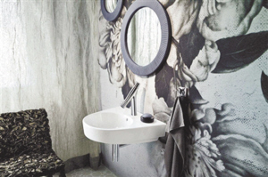 灰色的墙面搭配圆圆的镜子,让浴室整体变得时尚而有个性。石头的台面和白色台盆,都迎合了时尚前卫的因素。最特别的是,地面上各种各样的花纹图案让整个大空间热闹了起来,显得花团锦簇,绿色植物成为简约空间里最温暖的点缀。