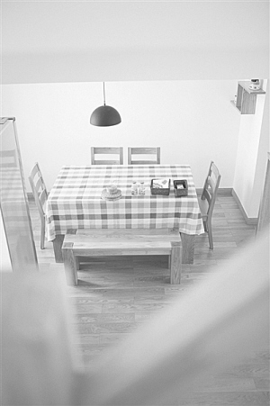 除此之外,主人喜欢绿色植物和收集布料,家里的装饰品也多是这两种。例如餐桌铺上格子餐垫,非常温馨;进门处的木质墙玄关上挖个洞放小植物,避免单调之感。