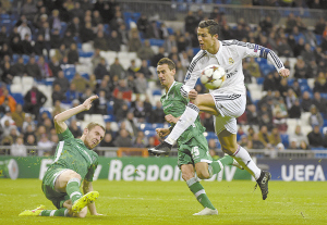 卢多戈雷茨队的马塞利尼奥在第20分钟禁区内手球,不仅送给皇马点球,自己还被罚出场外。C罗一蹴而就,攻入个人欧冠历史上的第72球。贝尔、阿韦洛亚和梅德兰此后又入三球,“银河战舰”主场四球大胜。