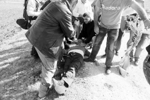 人们试图抢救受伤的巴定居点事务部长齐亚德·阿布·艾因