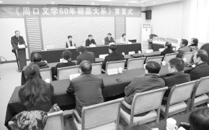 本报讯 历时5年编撰、共六大卷、300多万字的《周口文学60年精品大系》昨日在周口饭店举行首发式(如图)。据悉,《周口文学60年精品大系》一书,收录建国后至2009年的60年间的周口籍作家的精品力作,是周口作家群的集体亮相,更是展示“周口作家群” 的阵容、实力、风采的一个平台。