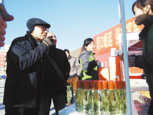 劲牌毛铺苦荞酒自进入我市以来,积极推广健康饮酒新理念,通过事件营销等手段,迅速占领市场。12月21日上午,该酒业代理商赞助了周口晚报第三届包饺子大赛,为12名获奖选手赠送了礼品,并开展了免费品鉴活动。图为市民在观看比赛之余品尝该酒。记者 付永奇 摄