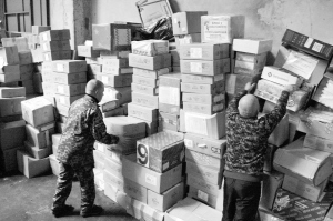 12月21日,在乌克兰顿涅茨克,工作人员卸载人道主义援助物资。