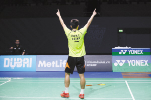 当地时间12月21日,谌龙庆祝夺冠。当日,在阿联酋迪拜举行的国际羽联世界超级系列赛总决赛男子单打决赛中,中国选手谌龙以2∶0战胜丹麦选手维汀哈斯,获得冠军。新华社记者 李震 摄