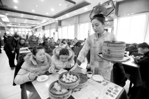 12月22日,在有着180余年历史的沈阳老边饺子馆,一名工作人员为顾客端上热腾腾的饺子。