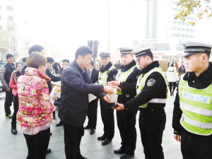 冬至当天,在团市委的倡议下,周口市区祥轩文化餐饮公司提供400多斤煮熟的饺子,送到中心城区值勤交警手中。晚报记者 徐松 摄