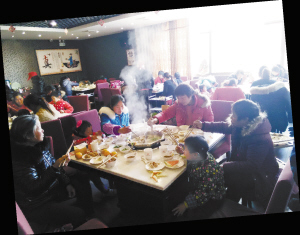 11时30分许,爱心火锅店的老板邀请孩子和家长到自己的店内就餐(如图)。为了表示欢迎,店内的员工特意表演了舞蹈《小苹果》。不少孩子看到后跑上前去跟着大家一起跳。在此期间,部分员工在桌子上摆放食材。