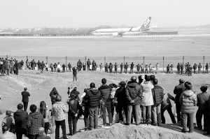 12月23日,人们在湖南衡阳南岳机场外观看刚刚降落的一架北京至衡阳航班飞机。