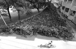 12月22日,湖南一高校操场旁的宿舍楼前,成百上千的废弃自行车堆积如山,从高空俯瞰,犹如一个大型的“自行车坟场”。校内部分学生建议学校将这些自行车统一回收,进行翻新处理,捐赠给贫困生或者变成校园公共自行车。杨华峰 摄