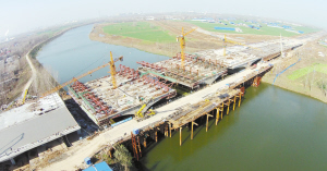 周口晚报“周晚一号”航拍飞行器镜头下即将合龙的东外环大桥。晚报记者 朱海龙 摄