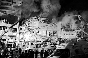 但是就在这个时候,火情已经持续很长时间了,楼体已经不堪重负,部分钢筋已经被烧化了,在2日晚9点37分,火场所在地的楼房,突然间发生了大面积的坍塌,当时正在二层救援的消防官兵也瞬间被埋在里面,2日夜里,扑救过程中又几次发生坍塌,而且每次发生坍塌以后,火灾现场马上就会发生复燃的现象,并且火势突然间将会加大,一度也是到了难以控制的状态,当时现场救援工作一度中止了一段时间。