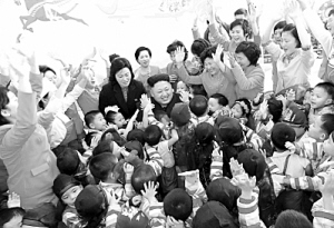 朝鲜最高领导人金正恩(中)1日在平壤幼儿园和孤儿院看望儿童。金正恩察看了平壤幼儿园和孤儿院的食堂、保育室、教育室、卧室、戏水场、智能游玩室等处,孩子们向金正恩献花、拜年。随后金正恩观看了孤儿院儿童的迎新演出,并同他们合影留念。新华社发