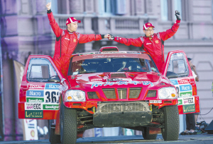 当地时间1月3日,中国东方赛车队车手钟磊(右)与领航员马淼在仪式上向观众致意。当日,2015达喀尔拉力赛举行象征性发车仪式。本届达喀尔拉力赛将于当地时间1月4日至17日在阿根廷、智利、玻利维亚展开。新华社发