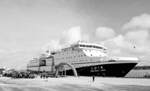 “三沙1号”长122.3米,宽21米,吃水深度5.4米,排水量7800吨,可搭载旅客456人,装载20辆标准集装箱车。投入运行后,从文昌清澜港到三沙永兴岛航行约10个小时,比目前的“琼沙3号”缩短约5个多小时。“三沙1号”还设有直升机起降平台,方便执行海上救援和岛礁巡查等任务。新华社记者 郭程 摄