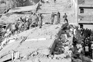 1月5日,在肯尼亚首都内罗毕,救援人员在坍塌住宅楼的废墟上搜寻幸存者。