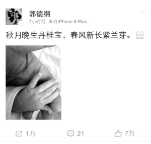 本报综合消息 2015年1月5日晚,一位曲艺圈人士在网上晒出郭德纲喜得贵子的微信截图,图中郭德纲写道:“岁在甲午,冬月十五。2015年1月5日,下午3点05分,郭门弄璋之喜……”还附上了托着新生儿的手的图片。1月6日上午,郭德纲在微博上也发布了类似的牵手照,搭档于谦转发称:“郭氏之福,于门之彩!”不少网友送上祝福。