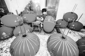 1月7日,义乌市官端前村一家灯笼生产企业的工人在制作传统灯笼。