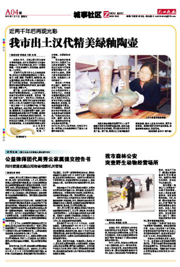据了解,出土时这对陶壶保存完整,但由于表面的绿釉含铅,入土时间较长,铅离子析出附着在釉表面,就形成“银光”,俗称“反铅”。经过专业人员清洗后,釉色明亮匀净。据周口市文物考古管理所负责人介绍,汉代釉陶艺术是中国实现大一统之后第一个文化高潮的产物。它气魄宏伟、造型端庄、线条简洁,没有复杂的结构,强调实用,只在腹部有两个铺首。这件绿釉陶壶雄伟高雅不次于青铜器,莹润明亮的釉层、华美的釉色则是它独有的。本次出土的这对陶壶更是有别于之前出土的其他汉代陶器,它们历经近两千年依然没有脱釉现象,且此类造型的陶器在我市出土也是首次,其做工精湛、十分精美,为国家珍贵文物。