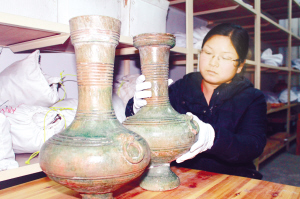 工作人员展示绿釉陶壶
