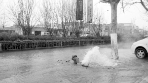 1月13日11时许,记者在周口市区庆丰中路景园·盛世华都小区门口西侧看到一个消火栓受损,水流喷涌而出,淹没了附近路面,给行人和车辆带来了不便。截至记者发稿时,损坏的消火栓已被修复。晚报记者 王凯 摄