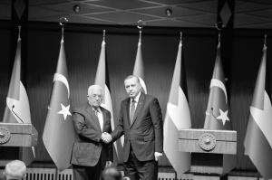 当地时间1月12日, 在土耳其首都安卡拉,土耳其总统埃尔多安(右)和巴勒斯坦总统阿巴斯在会谈后举行联合记者会。正在土耳其访问的巴勒斯坦总统阿巴斯12日重申将建立一个独立的巴勒斯坦国。新华社发