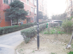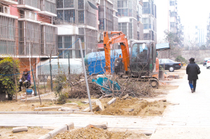 昨日上午,记者来到周口市区人民路万鑫苑东区,发现小区的部分绿地已被铲除,施工车辆正在进行停车位改造。部分楼前原有的绿地已经消失,栽种在绿地上的树木被移除,取而代之的是用石子铺成的停车位。