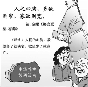 “淡泊以明志”,这是人生的最高境界,中国人历来提倡吃素,便是源于这种“淡”以养生的思想,认为吃素能修身静性。再比如“饮食有节”,也是古人养生的经验之谈,指的是要能控制自己的嗜欲。