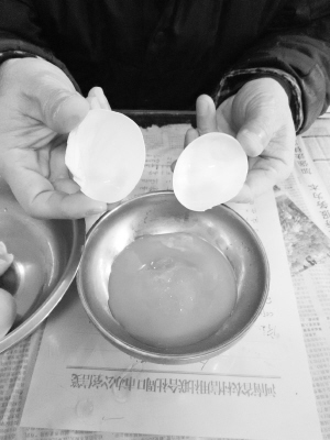 按照张先生的辨别方法,记者拿出三四个假鸭蛋,洗掉外面包裹的黄胶泥,经过仔细辨别才看出这些鸭蛋的蛋壳儿就像是制造出来的,所有的鸭蛋都一模一样。当记者打开一个生鸭蛋时,蛋壳内的胶状物“呼啦”一下子全部倒在了碗里,根本没有清黄之分,而是一塌糊涂,所谓的“黄”就是更粘稠一点的胶状物。