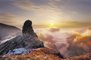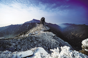 梵净山是贵州第一名山,最高峰海拔2572米,地形、地貌的特殊性使其形成独特的“小气候”。通常从12月份至次年2月下旬,山脚如常,山顶却积满了皑皑白雪,呈现“山顶积雪山脚晴”的特殊景观。