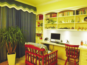 于是,书房便与客厅相连在一起,书柜、书桌都是定制的。整齐划一的排列,看起来不显局促,还让空间得到了充分利用。
