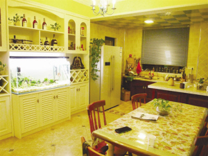餐厅的设计也延续了地中海风格,顶上的吊灯便是显著特征。蓝色的铁艺吊灯,以烛台的造型呈现,文艺清新。嵌入式的整体餐柜中间,还添加了一个水族缸,着重突出了海洋风。
