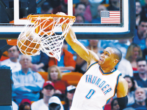 当地时间1月20日,雷鸣队球员威斯布鲁克在比赛中扣篮。当日,在2014-2015赛季NBA常规赛中,俄克拉荷马雷鸣队客场以94∶86战胜迈阿密热火队。新华社发