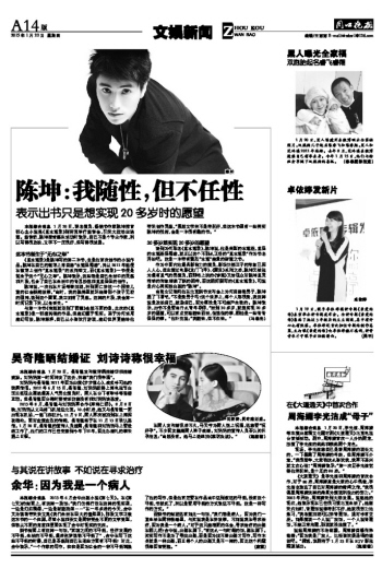 当美女记者问他在北京新书发布会上为何自称美男子,陈坤提了下眉毛,“不是美男子吗?这个世界上,每个人都很美,我这样说是放松自己,鼓励自己,因为埋没是不可能产生美的。陈坤表示,出书不是要当什么青年导师,“活到30多岁,就想实现20多岁的愿望,可以有点资格随性而活,做想做的事,哪怕是一些奇奇怪怪的事。”他补充说:“我随性,但不任性。”(马春光)