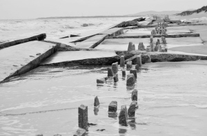 图为山东省日照市山海天旅游度假区两城街道安家河口至日照国家森林公园之间垮塌的数百米防潮堤(1月20日摄)。