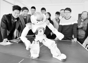 1月21日,内蒙古华昕立合科技有限公司研制的机器人“傲云”在表演蒙古族舞蹈《搏克舞》。